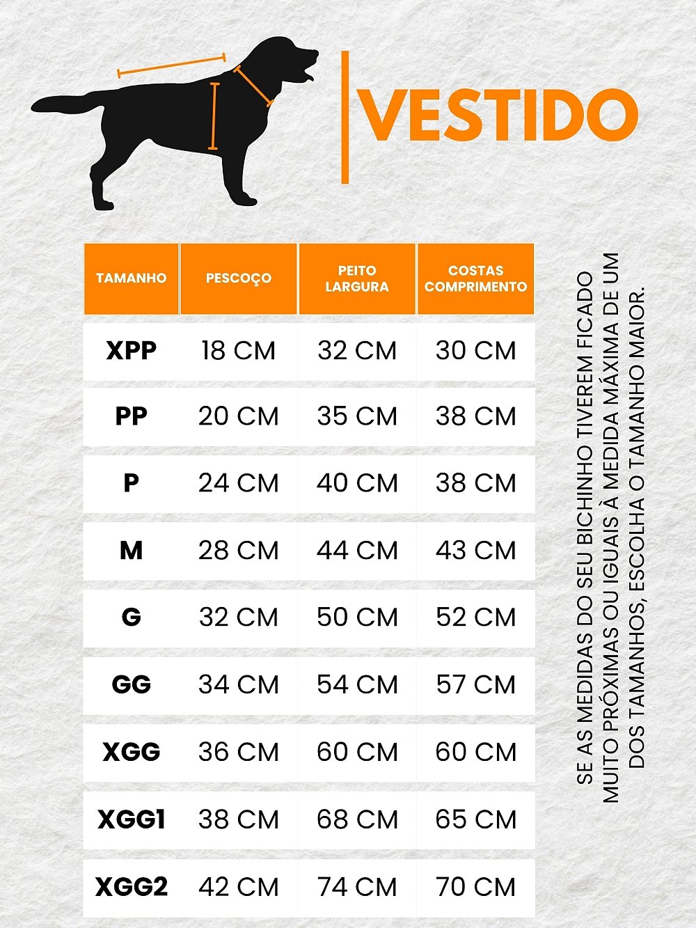 Para escolher o tamanho ideal, use uma fita métrica para medir sua pet e compare com nossa tabela de medidas. Lembre-se, como o tecido não tem elasticidade, o caimento soltinho é o mais recomendado para o conforto dela.
