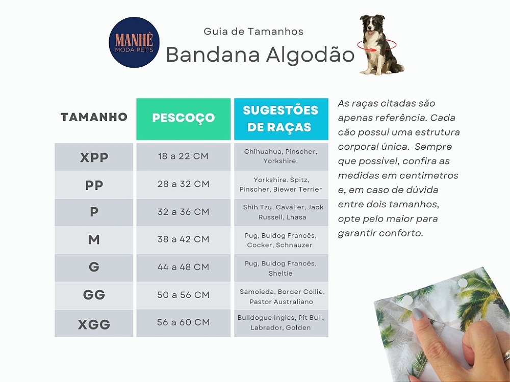 Para máximo conforto, a bandana deve ficar levemente solta, sem compressão. Se o seu cão possui histórico de alergias, recomendamos observar a adaptação nas primeiras horas de uso.
